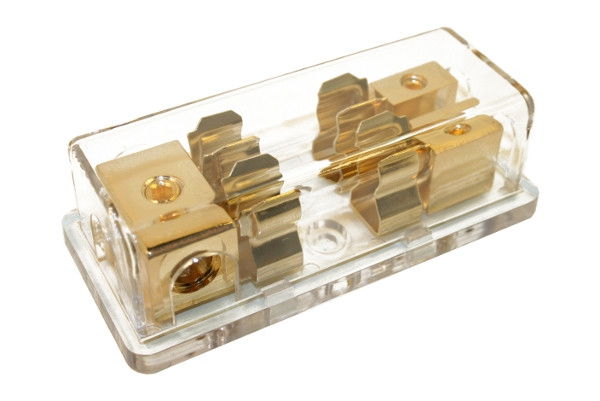 Guldförgyllt säkringshållare för AGU säkring för 3x 25mm2 in och 2x16mm2 ut kabel