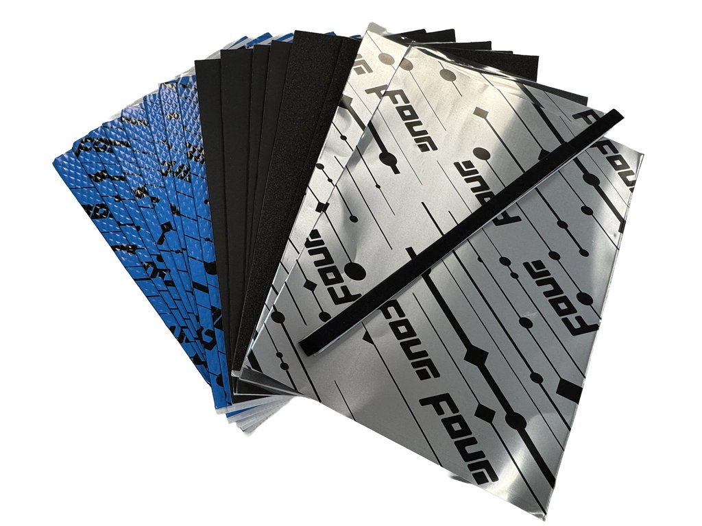 8 pcs of S3-Basemat = High-quality 3.0 mm thick alubutyl mat designed specifically to dampen disturbing resonances and improve sound insulation in various applications.