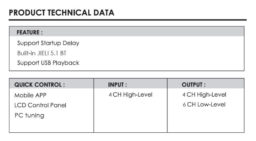 • Utgångar: 6-kanals lågnivå (RCA), förstärkareffekt 4 x 50W