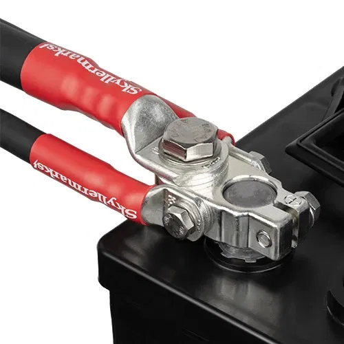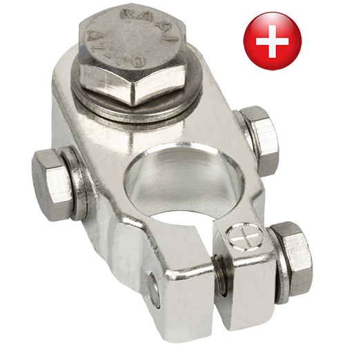 För en säker och strömstark anslutning till batteriets pluspol har Skyllermarks utvecklat denna genomarbetade polplint som kombinerar kopplingsplint och polsko i ett. Konstruktionen gör det möjligt att ansluta flera grova kablar utan att de ligger ovanpå varandra, vilket ger maximal kontaktyta och minimerar risken för spänningsfall även vid höga strömmar.