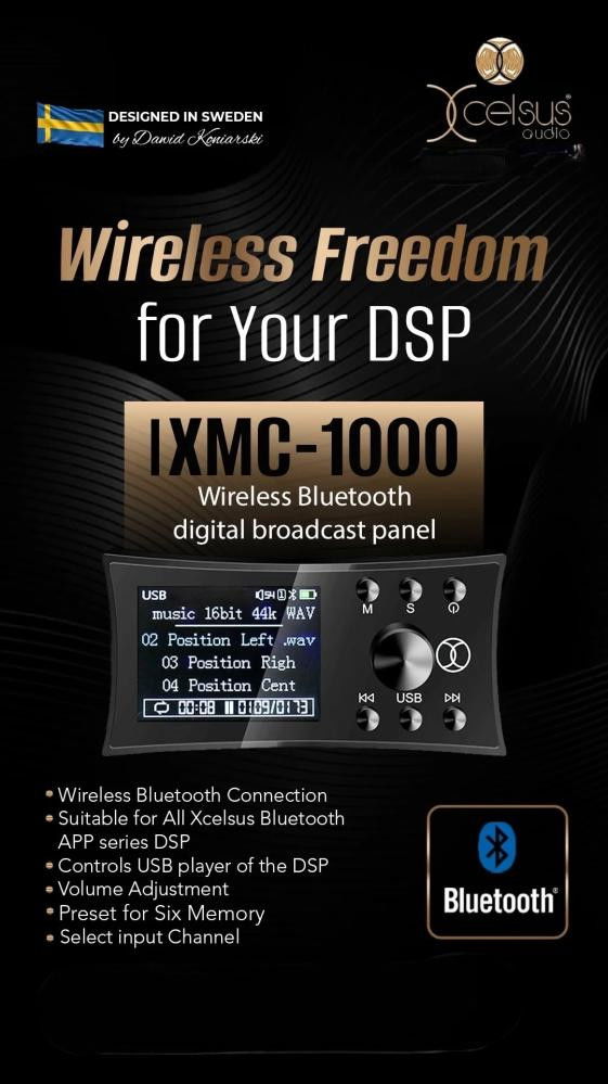 Med XMC-1000 får du full kontroll över din DSP via Bluetooth – utan sladdar. Enkel justering av volym, kanalval, och USB-uppspelning direkt från panelen. Passar alla Xcelsus DSP-enheter i Bluetooth-serien.